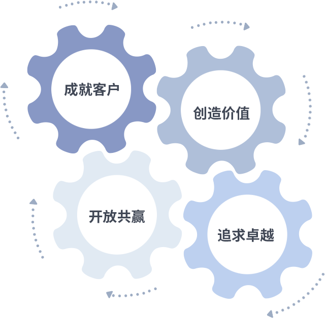 成就客户是一切决策的出发点,创造价值是衡量所有工作的标准,追求卓越是9001cc 以诚为本做事做人的态度,开放共赢是9001cc 以诚为本的格局也是最终的结果。价值观的齿轮环环相扣,推动着组织里的每个人不断向前。